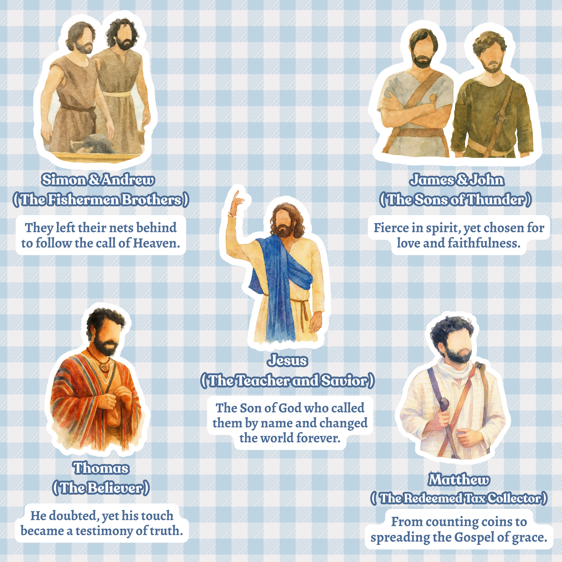 Step into the story of faith that changed the world. This watercolor sticker set honors Jesus and His twelve apostles. The ordinary men called to carry an extraordinary message.